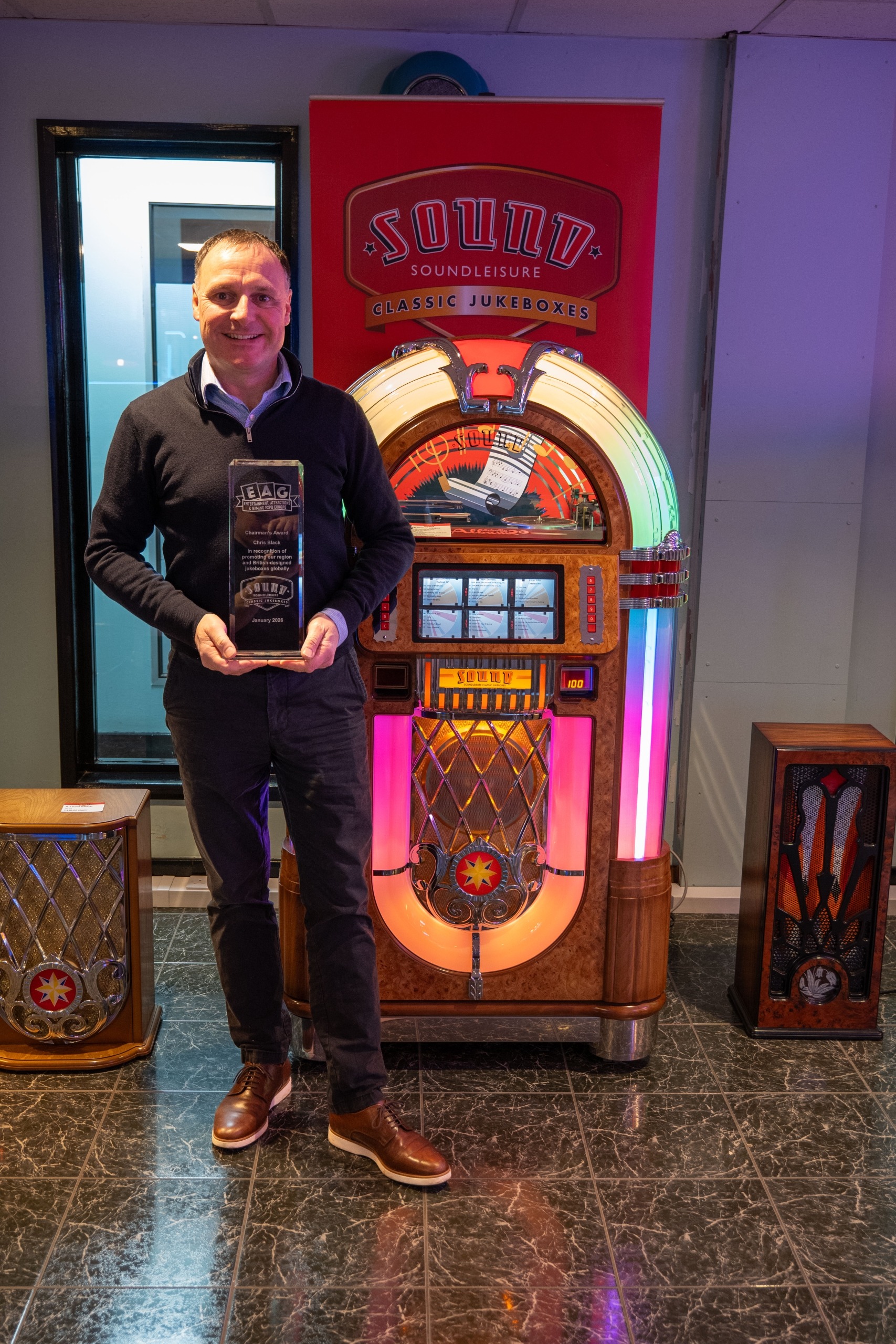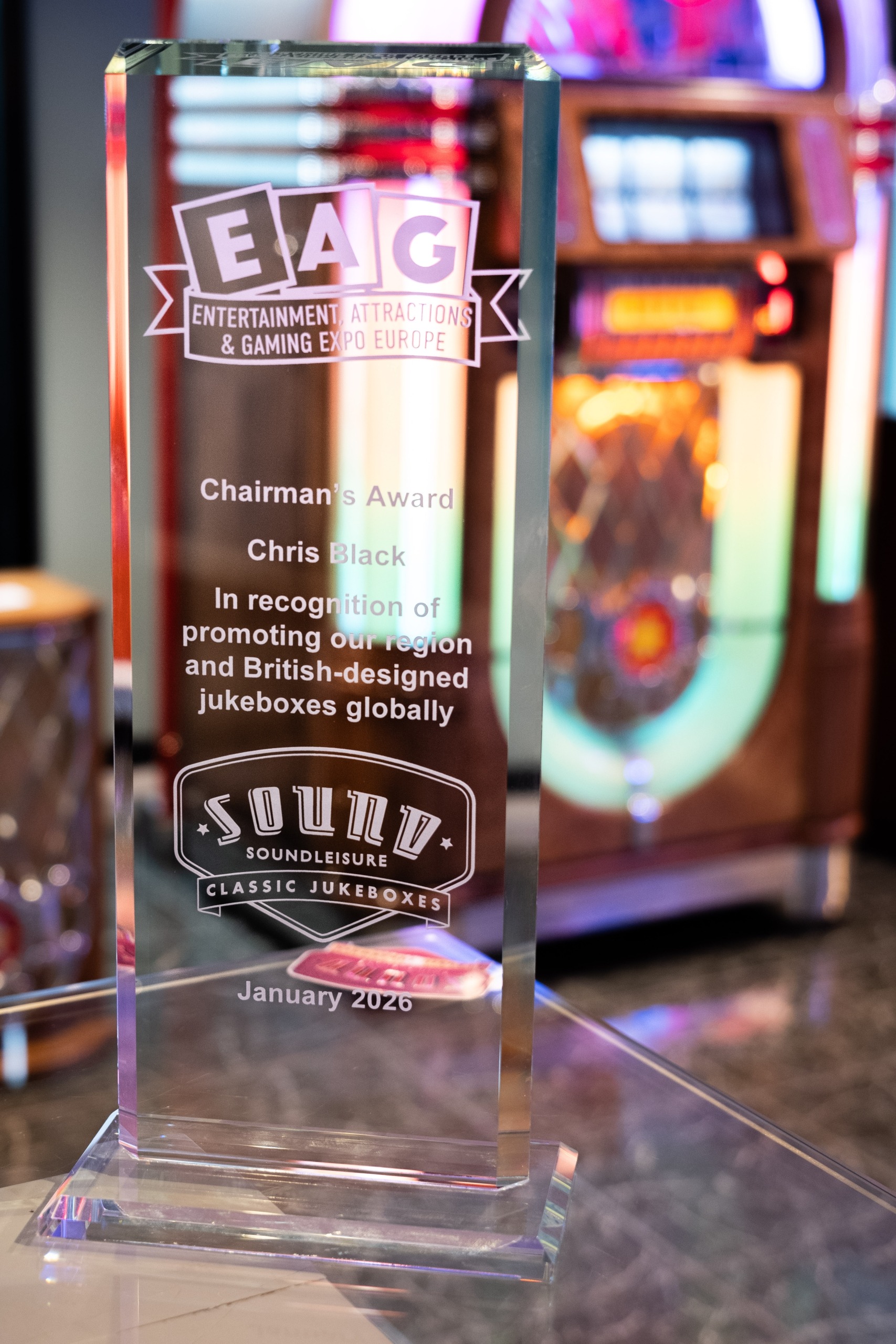 Whilst at the recent EAG Expo 26, held in London in January, our Joint Chairman, Chris Black, was presented with one of the EAG Chairman’s Awards in recognition of his support of British businesses through his role as a Department for Business and Trade Export Champion, and for promoting British designed and manufactured jukeboxes throughout the world.