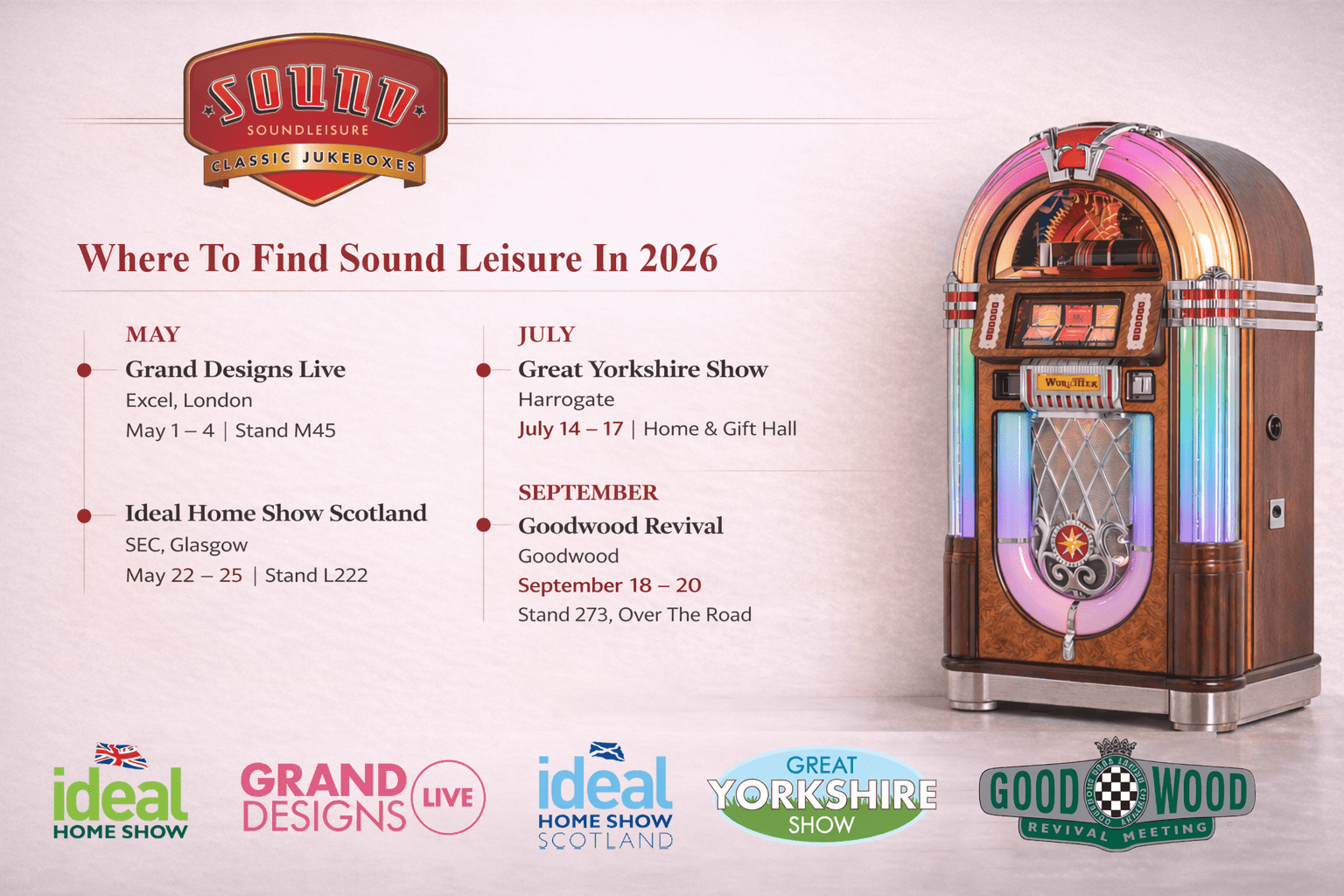 These events are a great opportunity for you to get up close with our jukeboxes and meet the team behind them. So, whether you’re at the start of your jukebox journey and just interested in learning more about Sound Leisure and our products, or further along and ready to place an order, our friendly team will be happy to help.